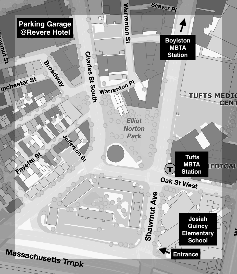 Validated parking is available at the Tufts Medical Center Parking Garage at 274 Tremont Street for $14.00. Validated parking will continue to be available at The Revere Hotel parking garage for $12.00. Visit the welcome table for a validation ticket for Tufts or a validation sticker for The Revere. Free metered parking (on Sundays) is available on surrounding streets.